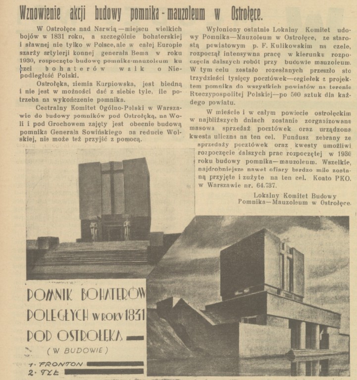 - Wyłoniony ostatnio Lokalny Komitet Budowy Pomnika—Mauzoleum w Ostrołęce, ze starostą powiatowym p. F. Kulikowskim na czele, rozpoczął intensywną pracę w kierunku rozpoczęcia dalszych robót przy budowie mauzoleum. W tym celu zostało rozesłanych przeszło sto trzydzieści tysięcy pocztówek - cegiełek z projektem pomnika do wszystkich powiatów na terenie Rzeczypospolitej Polskiej - po 500 sztuk dla każdego powiatu - pisał "Przegląd Ostrołęcki".