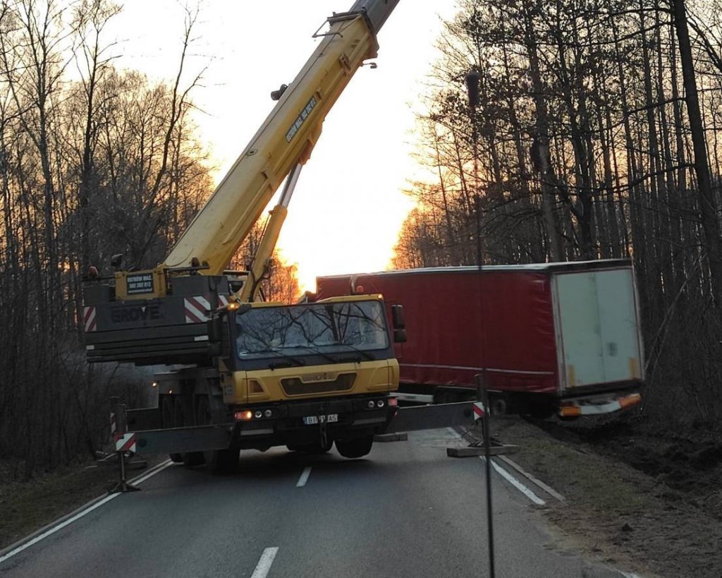 Do zdarzenia doszło w miniony czwartek, 24 marca w miejscowości Brok (powiat ostrowski). Kierujący ciężarówką jadąc drogą wojewódzką nr 694 nie dostosował prędkości do swoich umiejętności i warunków drogowych i w efekcie tego stracił panowanie nad pojazdem a następnie zjechał do przydrożnego rowu, gdzie ciężarówka wraz z naczepą przewróciła się na jeden bok.