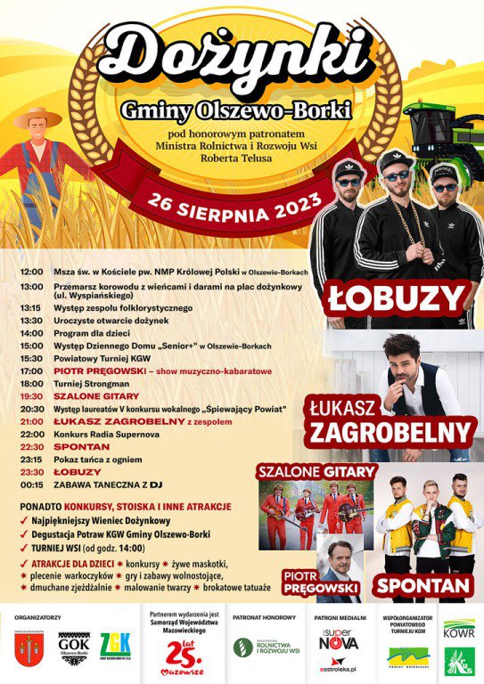 Już w najbliższą sobotę w Olszewie-Borkach odbędzie się impreza, jaką zapamiętamy na długo! Dożynki pod honorowym patronatem ministra Roberta Telusa będą miały znakomitą obsadę plejady gwiazd muzycznych i nie tylko.