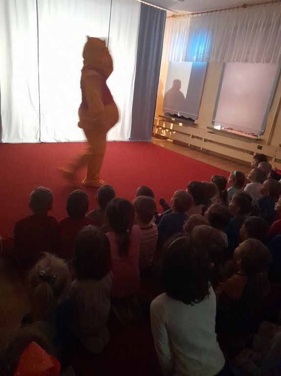 Przedszkolaki z „Krainy Misiów” odwiedził Kubuś Puchatek i jego przyjaciele z teatru cieni. Tym razem tematem spektaklu i rozmowy misia z dziećmi była ekologia.