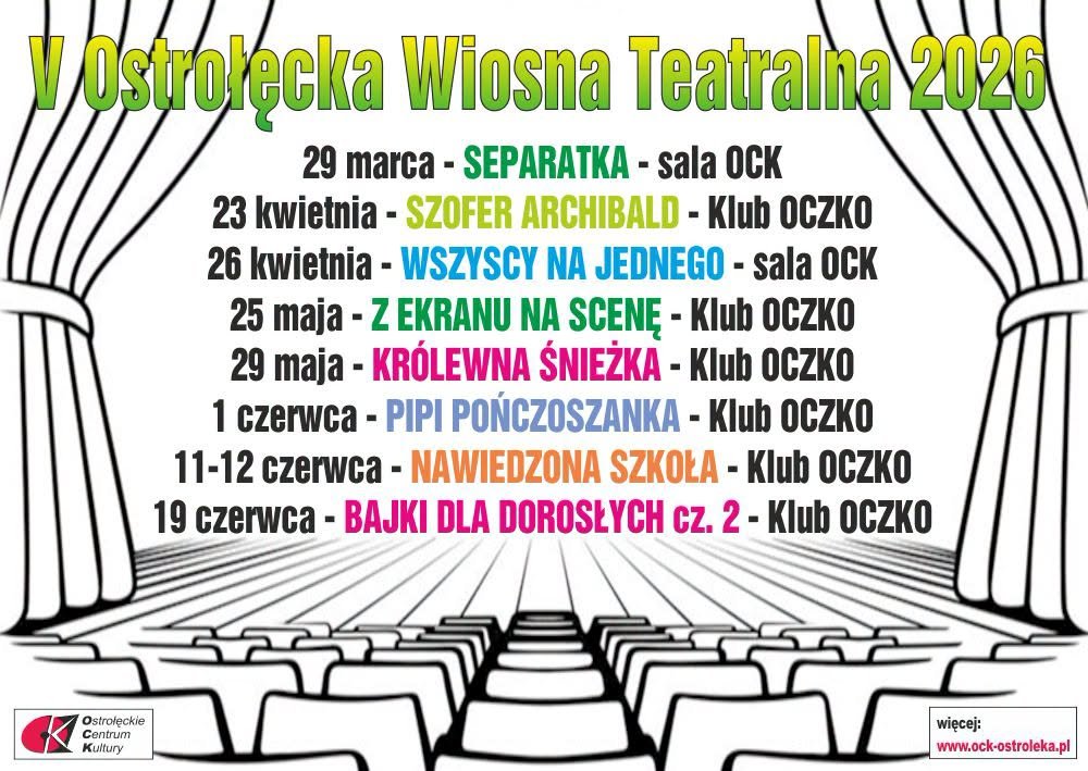 Wiosna w naszym mieście to nie tylko słońce, ale też sporo ciekawych wydarzeń na deskach teatrów. Właśnie trwa V Ostrołęcka Wiosna Teatralna. Jeśli nie udało Wam się załapać na marcową „Separatkę”, spokojnie - kalendarz pęka w szwach, a najciekawsze przedstawienia dopiero przed nami.