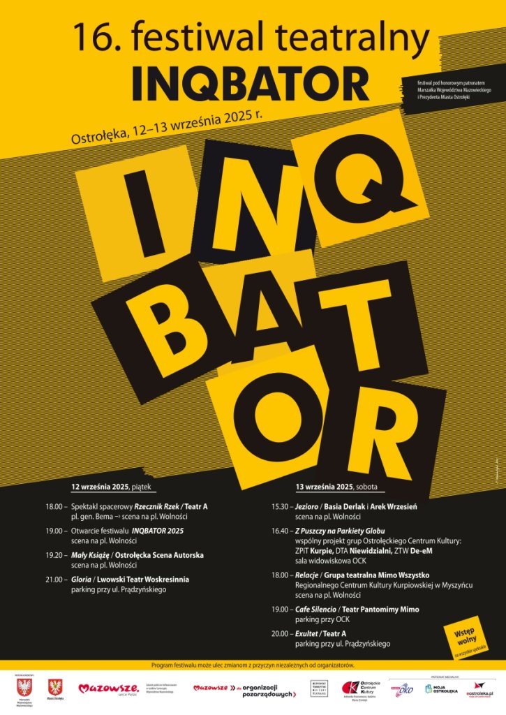 16. Festiwal Teatralny InQbator to okazja, by przeżyć teatr w innej formie – spontaniczny, otwarty i angażujący. Organizatorzy zapraszają do wspólnego świętowania i odkrywania sztuki w przestrzeni Ostrołęki.