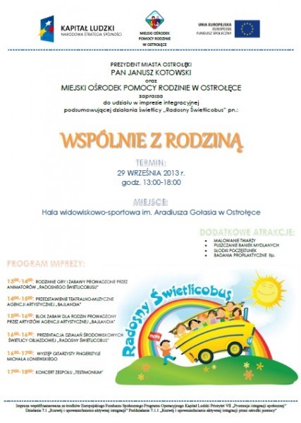 W programie imprezy organizowanej przez Miejski Ośrodek Pomocy Rodzinie pod patronatem prezydenta Ostrołęki Janusza Kotowskiego znajdą się m.in. rodzinne gry i zabawy z „Radosnym Świetlicobusem”, spektakl teatralno-muzyczny w wykonaniu grupy artystycznej „Bajlandia”. Festyn będzie także okazją do podsumowania działań „Radosnego Świetlicobusu”.
