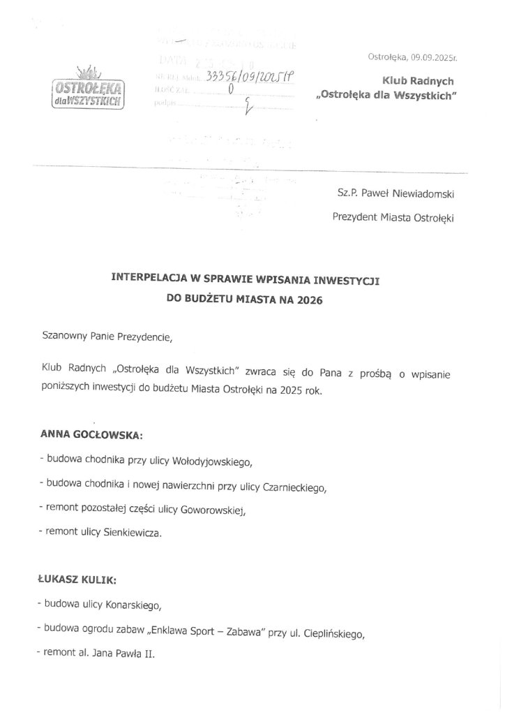 Radni z klubu "Ostrołęka dla Wszystkich" złożyli w magistracie obszerną interpelację z propozycjami inwestycji, które ich zdaniem powinny znaleźć się w przyszłorocznym budżecie miasta. Lista obejmuje kilkadziesiąt projektów infrastrukturalnych i rekreacyjnych.