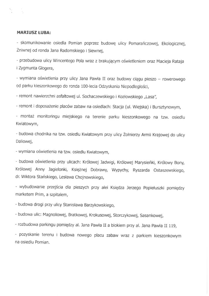 Najbardziej rozbudowany katalog propozycji przedstawił radny Mariusz Łuba, który skupia się przede wszystkim na potrzebach mieszkańców osiedla Pomian i tzw. osiedla Kwiatowego. Jego propozycje obejmują między innymi skomunikowanie osiedla Pomian poprzez budowę całego układu ulic: Pomarańczowej, Ekologicznej, Żniwnej i Siewnej, co od lat jest jednym z głównych postulatów mieszkańców tej części miasta.