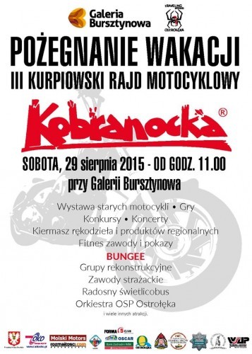 W sobotę, 29 sierpnia Galeria Bursztynowa i Klub Turystyki Motocyklowej Travelling Spiders Ostrołęka zapraszają do udziału w imprezie pn. „Pożegnanie wakacji III Rajd Kurpiowski”. Zarówno dla starszych, jak i młodszych organizatorzy przygotowali mnóstwo atrakcji. Zapowiada się, że będzie to jedna z większych imprez w naszym mieście w ciągu ostatnich kilku lat.