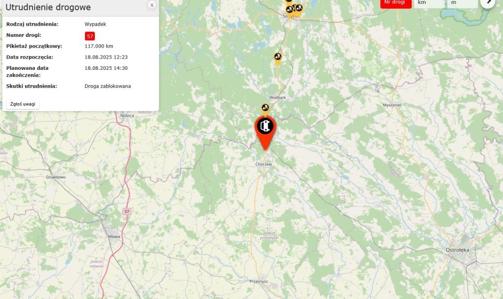 "Droga jest zablokowana w obu kierunkach. Konieczne są objazdy - w kierunku Szczytna przez Rembielin do W616, dalej w kierunku Opaleńca. Prosimy o stosowanie się do poleceń funkcjonariuszy" - informuje mazowiecka policja.