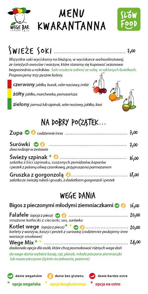 Z powodu obowiązujących ograniczeń nasze potrawy sprzedajemy obecnie wyłącznie na wynos i z dowozem. Pakujemy je w ekologiczne opakowania biodegradowalne. Wykonane wyłącznie ze składników roślinnych. Nic nie pakujemy w plastik. Staramy się wprowadzać pojemniki szklane wielokrotnego użytku (słoiczki na desery, butelki szklane)