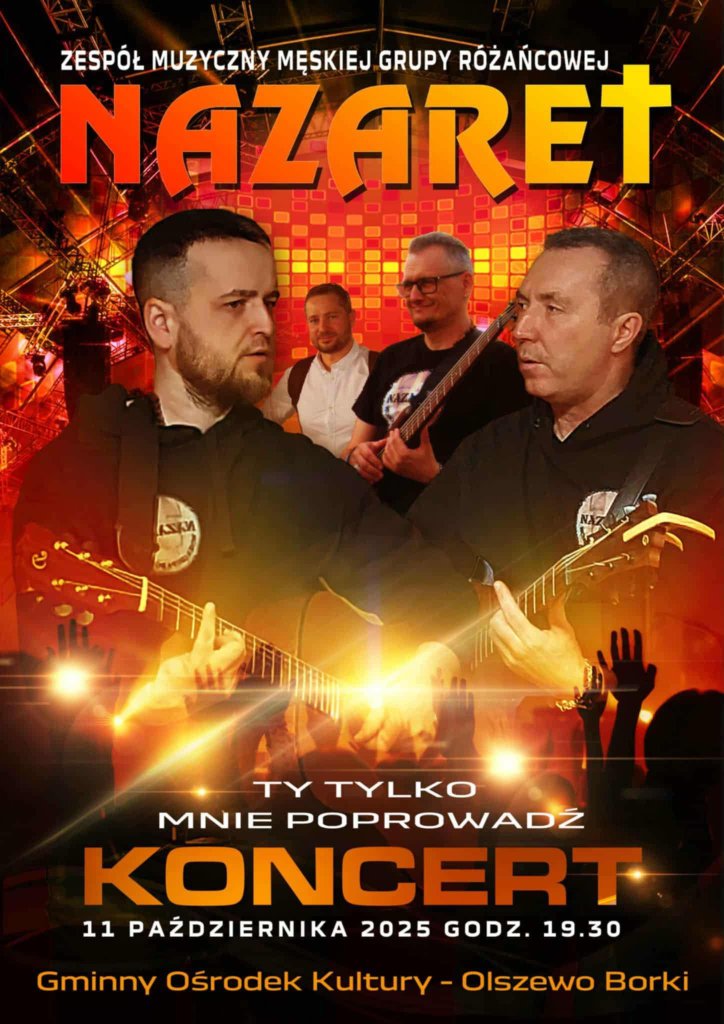 Już w sobotę, 11 października 2025 roku o godz. 19:30, w Gminnym Ośrodku Kultury w Olszewie-Borkach odbędzie się wyjątkowy koncert zespołu muzycznego Męskiej Grupy Różańcowej - Nazaret. Wydarzenie odbędzie się pod hasłem „Ty tylko mnie poprowadź” i zapowiada się jako poruszający wieczór pełen muzyki.