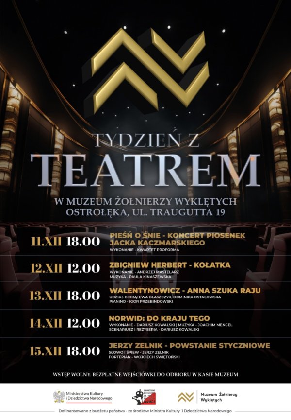 Muzeum Żołnierzy Wyklętych zaprasza na „Tydzień z teatrem” – od 11 do 15 grudnia będzie można obejrzeć u cztery przedstawienia w wykonaniu znanych polskich aktorów i wysłuchać koncertu piosenek Jacka Kaczmarskiego.