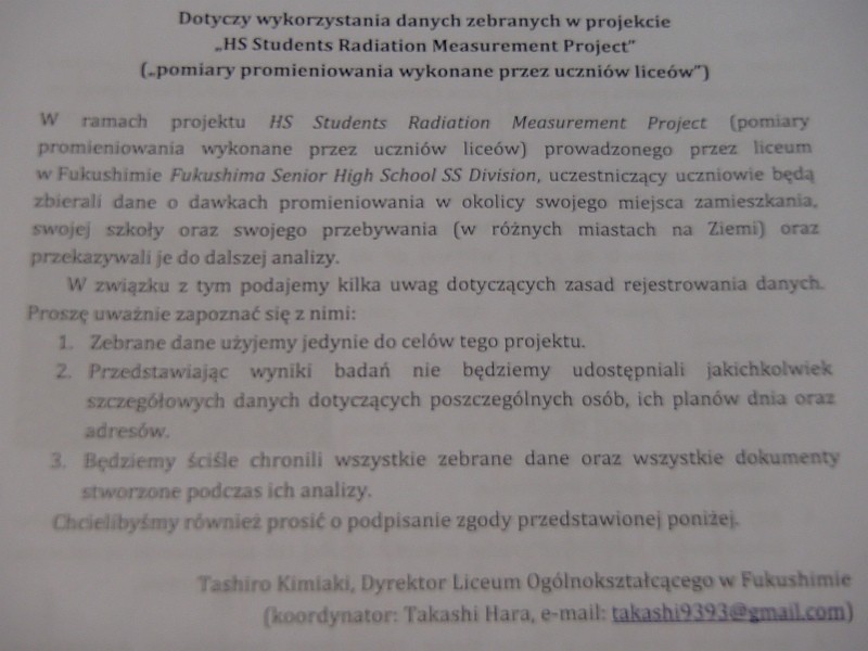 Wyniki zebrane przez uczniów klasy I B III LO: Kamila Borosa, Krzysztofa Czerkasa, Mateusza Klepuszewskiego, Adriana Piskowskiego i Aleksandra Płocharskiego, a także uczniów kilku innych szkół w Polsce, bedą przekazane do Japonii. Przygotowany na ich podstawie raport, zostanie zaprezentowany podczas telekonferencji z udziałem polskiej i japońskiej młodzieży.