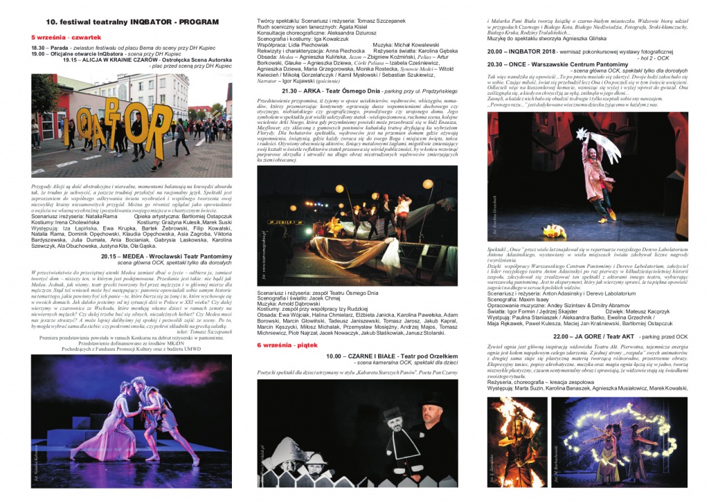 O wszystkich wydarzeniach, spektaklach i konkursach towarzyszących InQbatorowi przeczytacie też w okolicznościowej gazetce. „Ulicznica” dostępna jest w OCK, będzie także rozdawana podczas parady i w trakcie spektakli.