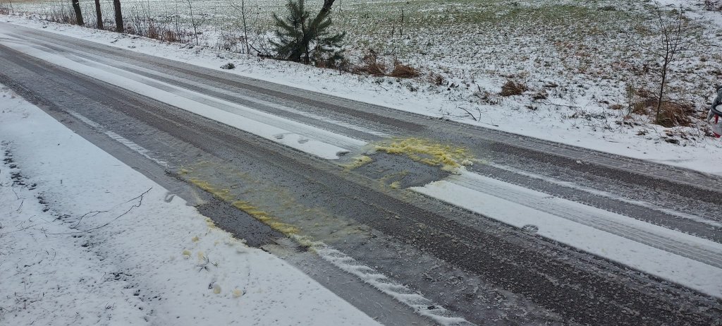 Nie dość, że śliska, bo zaśnieżona to w dodatku z niebezpieczną plamą oleju niewiadomego pochodzenia. Strażacy ochotnicy z Czarni interweniowali dziś do zdarzenia na jednej z lokalnych dróg.
