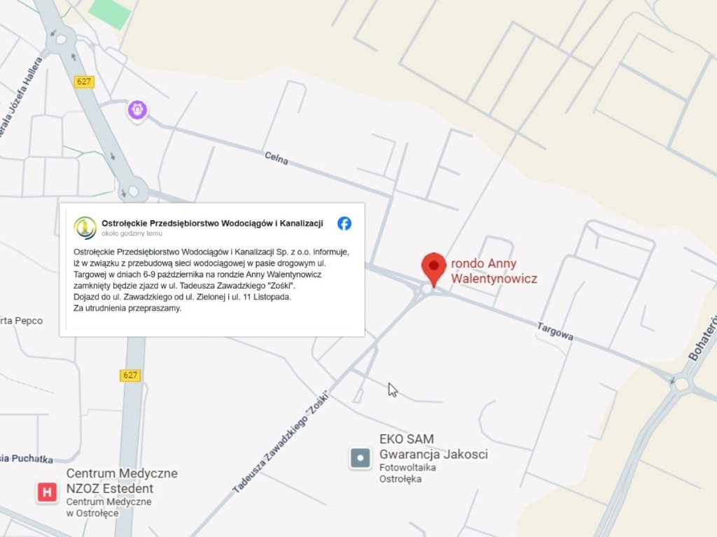Jak poinformowało Ostrołęckie Przedsiębiorstwo Wodociągów i Kanalizacji, w dniach 6-9 października zamknięty zostanie zjazd z ronda Anny Walentynowicz w ulicę Tadeusza Zawadzkiego "Zośki". Powodem utrudnień jest przebudowa sieci wodociągowej prowadzona w pasie drogowym ulicy Targowej.