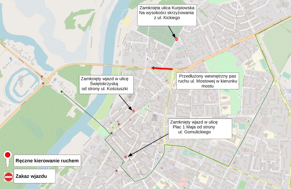 Zamknięta będzie również ulica Kurpiowska na wysokości skrzyżowania z ul. Kickiego. Dla usprawnienia ruchu przedłużony będzie wewnętrzny pas ul. Mostowej w kierunku mostu im. kard. Stefana Wyszyńskiego. Z kolei na placu 1 Maja i wlocie z ul. Warszawskiej i Stacha Konwy do ronda im. ks. Siemowita III ruch będzie kierowany ręcznie.