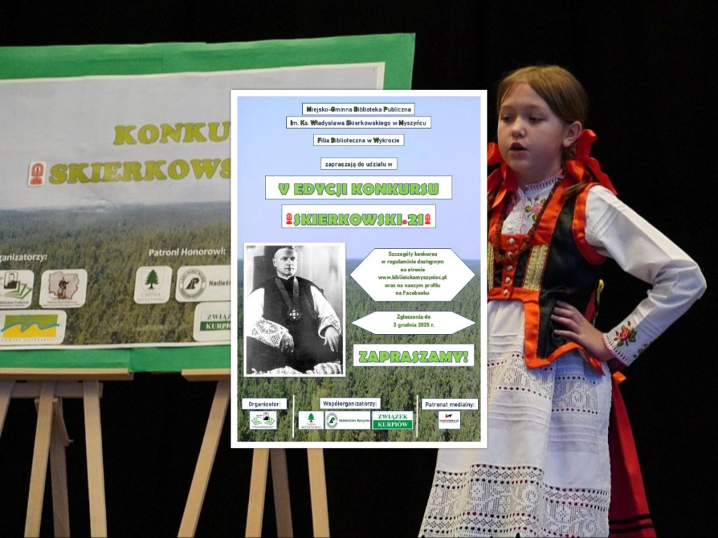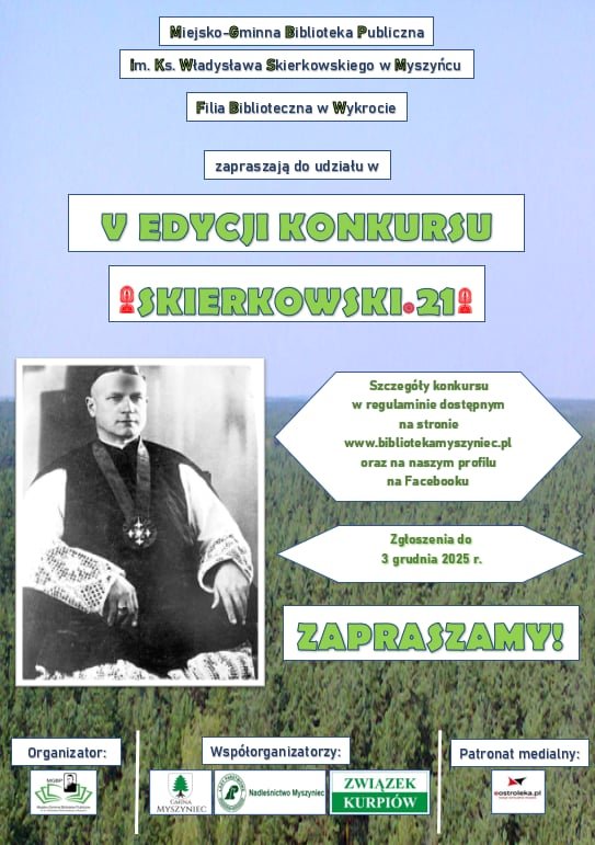 Miejsko-Gminna Biblioteka Publiczna im. Ks. Władysława Skierkowskiego w Myszyńcu wraz z Filią Biblioteczną w Wykrocie organizują piątą edycję międzygminnego konkursu "Skierkowski.21". Zgłoszenia można składać do 3 grudnia 2025 roku.