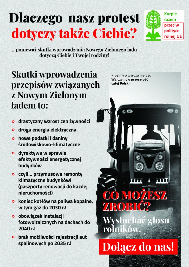 Zielony ład to nie tylko uderzanie w rolników, zielony ład to ogrom zakazów i nakazów, które uderzą w każdego mieszkańca bezpośrednio – chociażby kotły na paliwa kopalne, koniec z rejestracją aut spalinowych – co równa się z wykluczeniem społecznym części społeczeństwa, oraz pośrednio – wzrost cen wszystkich produktów – my jako rolnicy poniesiemy dużo większe koszty produkcji, a w zapłacicie więcej w sklepach. Najważniejsze jest to, że to my na dole zapłacimy za to wszystko swoją wolnością oraz pieniędzmi, którymi ktoś na górze się podzieli…
