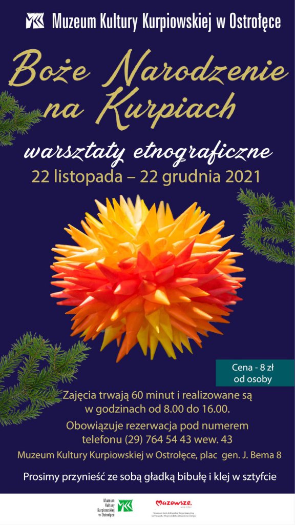 Muzeum Kultury Kurpiowskiej w Ostrołęce zaprasza dzieci i młodzież szkolną do udziału w warsztatach etnograficznych „Boże Narodzenie na Kurpiach”. Zajęcia przybliżą uczestnikom obyczaje, zwyczaje i obrzędowość związaną ze świętami Bożego Narodzenia.