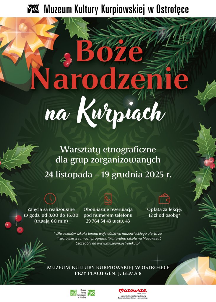 Muzeum Kultury Kurpiowskiej w Ostrołęce zaprasza grupy zorganizowane do udziału w dorocznych warsztatach etnograficznych „Boże Narodzenie na Kurpiach”. Podczas zajęć uczniowie z regionu Puszczy Kurpiowskiej poznają tradycje, zwyczaje i obrzędy związane z obchodami świąt Bożego Narodzenia.