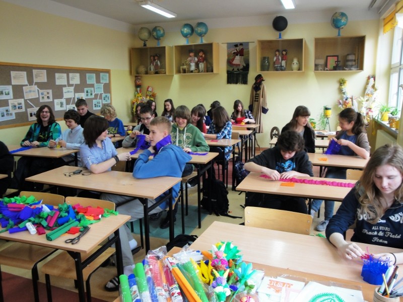 fot. Gimnazjum nr 1 w OstrołęceUczniowie chętnie próbowali swoich sił w tworzeniu tradycyjnych palm wielkanocnych i kart świątecznych. Dowiedzieli się też, jak dużo pracy trzeba było kiedyś włożyć by wykonać ozdoby świąteczne.