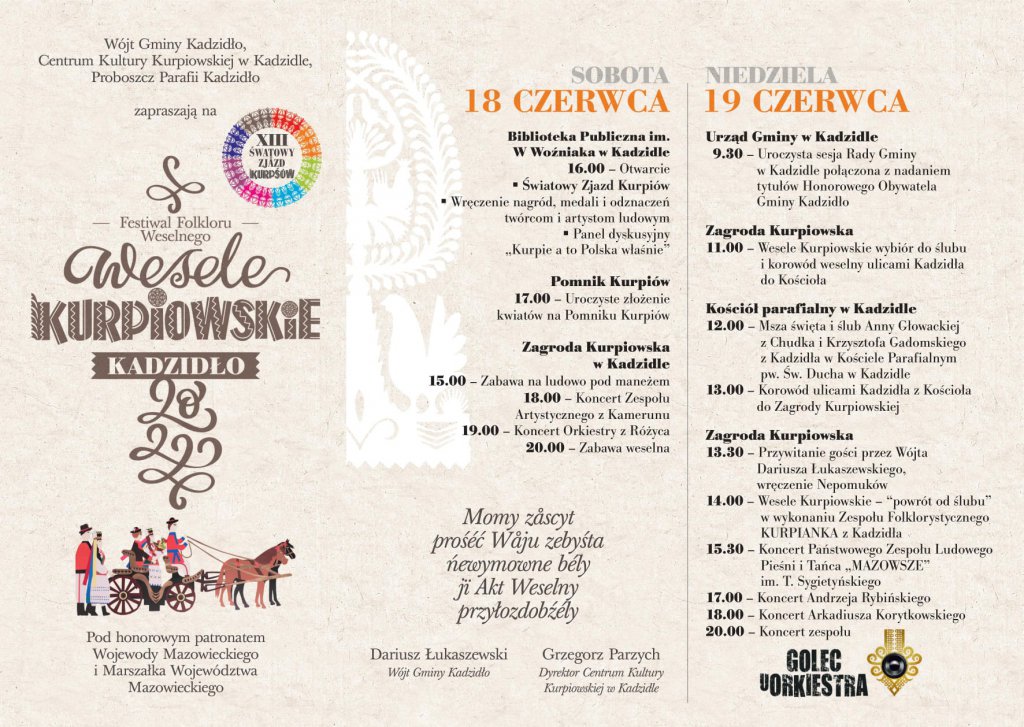 Wesele Kurpiowskie 2022 odbędzie się w dniach 18 – 19 czerwca. W programie dwudniowego festiwalu zaplanowano m.in. Światowy Zjazd Kurpiów z wręczeniem nagród, medali i odznaczeń zasłużonym twórcom ludowym i artystom, panel dyskusyjny „Kurpie a to Polska właśnie”, uroczyste złożenie kwiatów na Pomniku Kurpiów, zabawę na ludowo pod menażem, koncert Zespołu Artystycznego z Kamerunu, Orkiestry z Różyca, zabawę weselną, uroczystą sesję Rady Gminy.