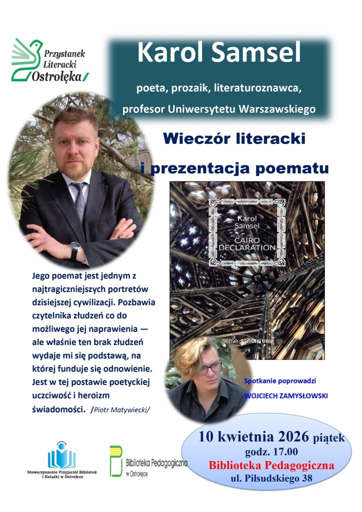 W najbliższy piątek, 10 kwietnia, w Ostrołęce odbędzie się spotkanie z Karolem Samselem - pochodzącym z naszego miasta poetą, pisarzem i profesorem Uniwersytetu Warszawskiego. Wydarzenie zostanie zorganizowane w Bibliotece Pedagogicznej przy ul. Piłsudskiego 38.