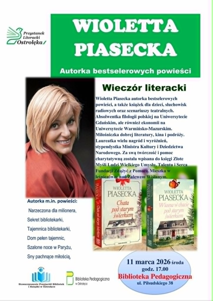 Już w najbliższą środę, 11 marca, miłośnicy dobrej lektury z Ostrołęki będą mieli okazję do osobistego spotkania z wyjątkową pisarką. W Bibliotece Pedagogicznej zagości Wioletta Piasecka - autorka, która potrafi wzruszyć zarówno dzieci, jak i dorosłych czytelników.