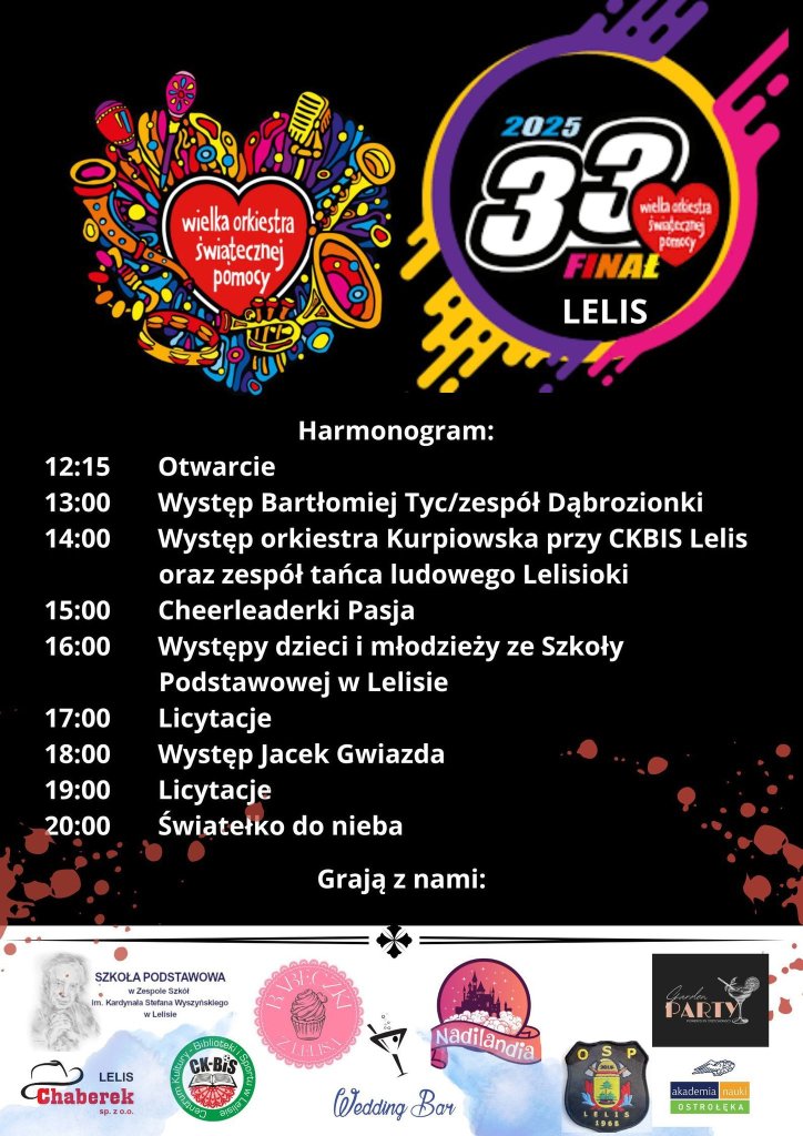 33. Finał Wielkiej Orkiestry Świątecznej Pomocy odbędzie się 26 stycznia w Lelisie. Wydarzenie, organizowane wspólnie przez lokalny samorząd i Szkołę Podstawową, będzie miało miejsce w hali sportowej przy szkole podstawowej.