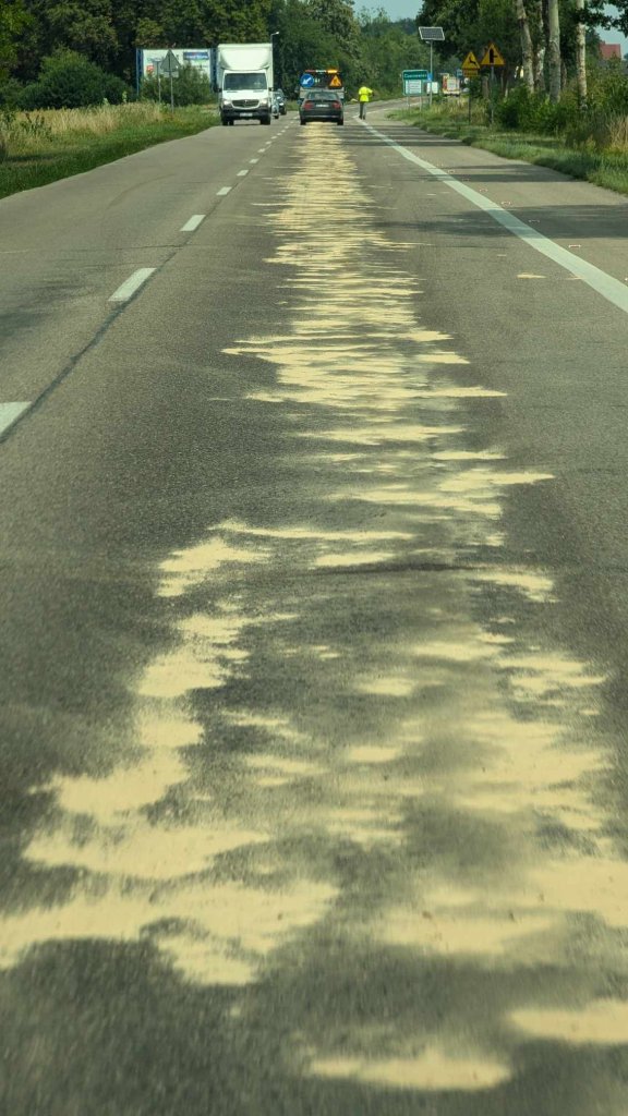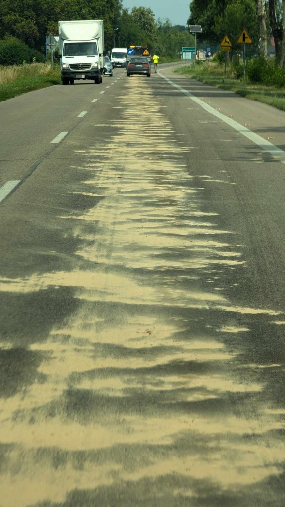 Kilka jednostek strażackich zostało zadysponowanych w czwartkowe przedpołudnie do usuwania wielkiej plamy na trasie z Ostrołęki w kierunku Goworowa. Na drodze rozlana była substancja powodująca śliskość jezdni, lecz nie była to substancja ropopochodna.