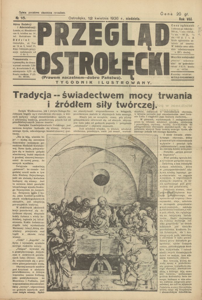 - Święta Wielkanocne, jak i święta Bożego Narodzenia bogate są w starodawne obyczaje, w których motywy religii chrześcijańskiej splotły się z odwieczną tradycją, przechowaną przez lud od przedhistorycznych jeszcze czasów - pisał "Przegląd Ostrołęcki" 12 kwietnia 1936 roku. Było to wydanie świąteczne, więc nie brakowało odniesień do świąt wielkanocnych i obyczajów panujących wówczas w naszym kraju.