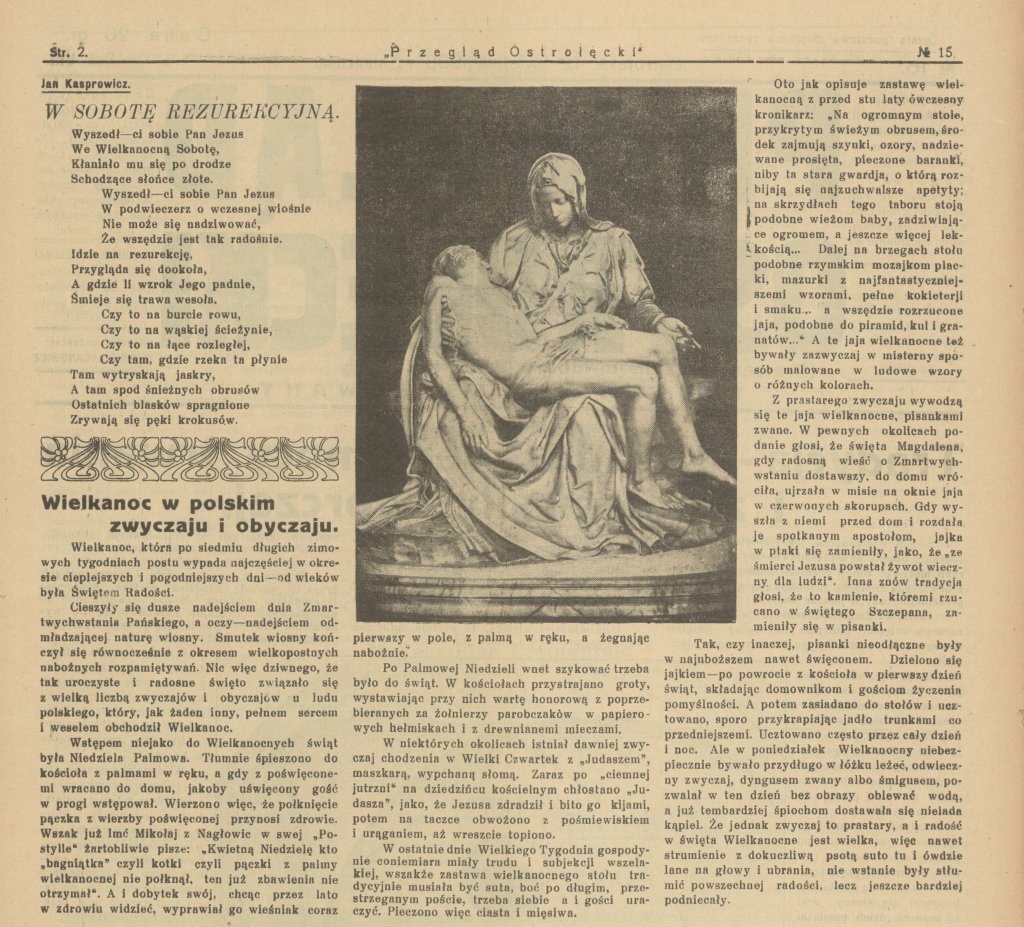 Na drugiej stronie "Przeglądu" znalazł się wiersz Jana Kasprowicza "W sobotę rezurekcyjną" oraz wspomnienienie polskich obyczajów wielkanocnych, począwszy od Niedzieli Palmowej, w trakcie której tłumnie spieszono do kościoła z palmami w ręku.