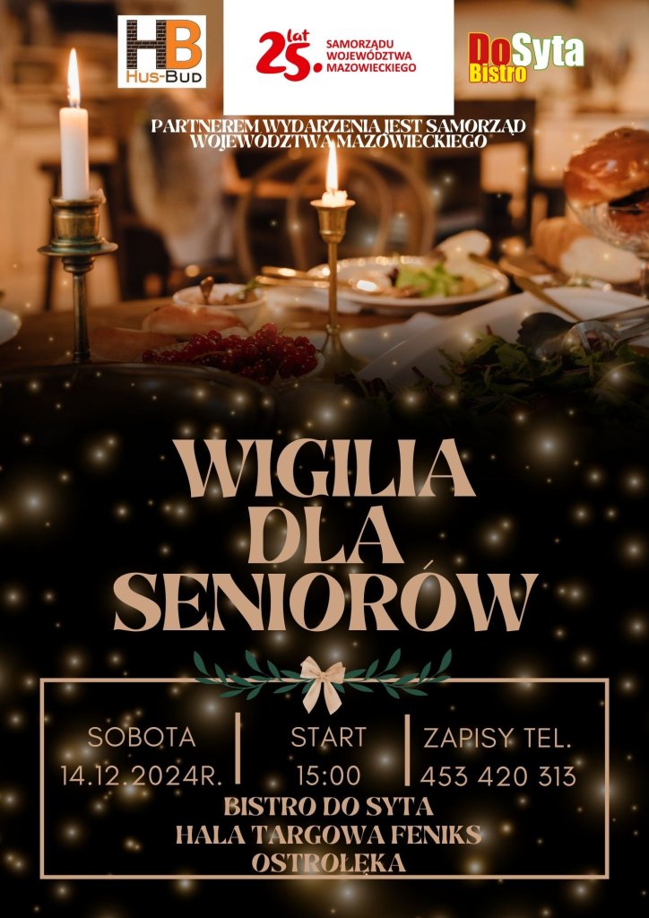 „Wigilia dla seniorów” odbędzie się 14 grudnia 2024r. w Bistro Do Syta w Hali Targowej Feniks w Ostrołęce. Celem wydarzenia jest integracja Seniorów z miasta Ostrołęki oraz z powiatu ostrołęckiego oraz nawiązywanie nowych przyjaźni/zaciśnięcie więzi społecznych, a także wspólne oczekiwanie i przeżywanie bożonarodzeniowego nastroju.