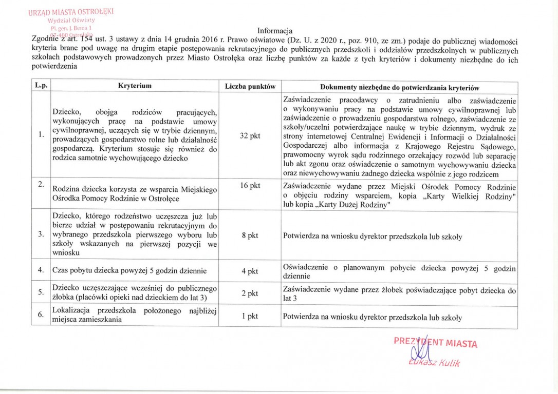 KRYTERIA NABORU DO PRZEDSZKOLI I ODDZIAŁÓW PRZEDSZKOLNYCH W OSTROŁĘCE: