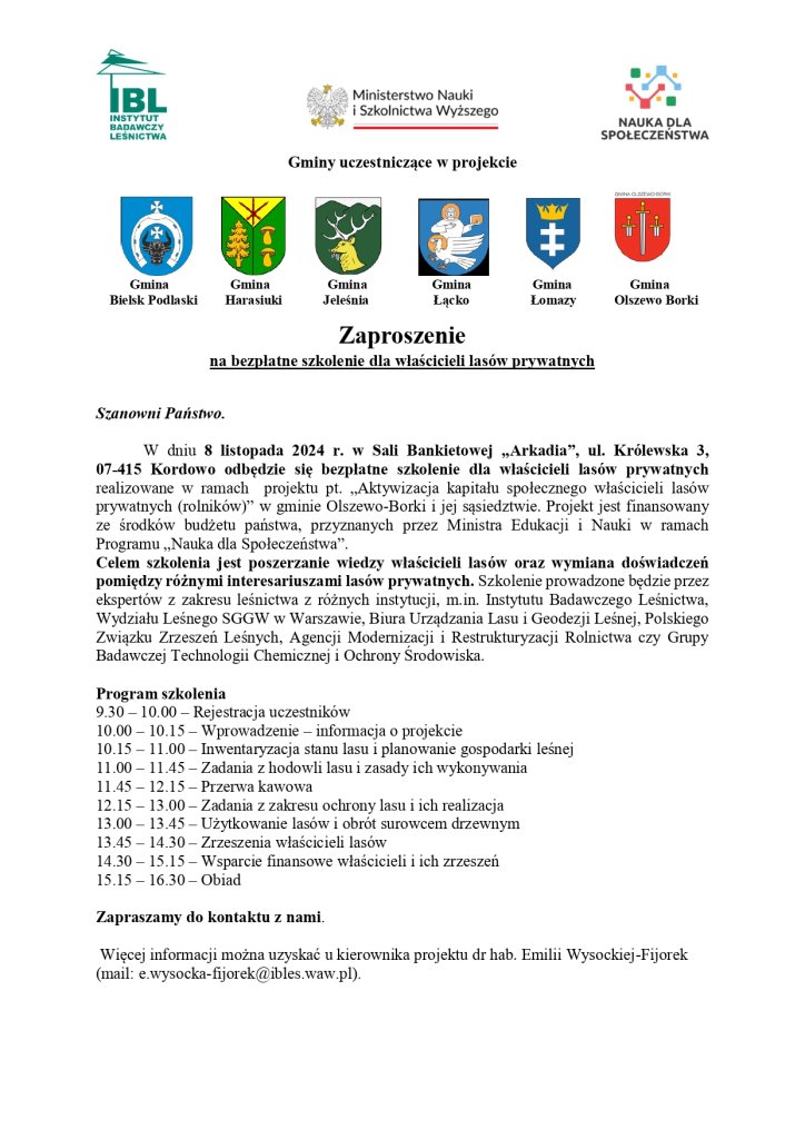 Szkolenie jest częścią projektu „Aktywizacja kapitału społecznego właścicieli lasów prywatnych (rolników)” finansowanego przez Ministerstwo Edukacji i Nauki. W trakcie wydarzenia eksperci z różnych instytucji, w tym Instytutu Badawczego Leśnictwa, Wydziału Leśnego SGGW w Warszawie, Biura Urządzania Lasu i Geodezji Leśnej, Polskiego Związku Zrzeszeń Leśnych, Agencji Modernizacji i Restrukturyzacji Rolnictwa oraz Grupy Badawczej Technologii Chemicznej i Ochrony Środowiska, przekażą uczestnikom wiedzę na temat: