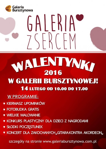 Nie masz pomysłu na prezent ani jak spędzić Walentynki z ukochaną osobą? W niedzielę, 14 lutego wybierz się do Galerii Bursztynowej. Tylko w tym dniu odbędzie się kiermasz walentynkowych upominków i słodkości, specjalne oferty dla klientów w naszych sklepach, a także kameralny koncert „Gitara kontra akordeon”.