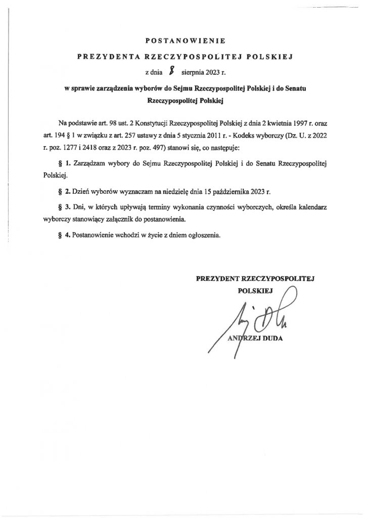 Wybory do Sejmu i Senatu zaplanowane są na jesień 2023 roku. Od początku w grze były cztery potencjalne daty: 15 października, 22 października, 29 października lub 5 listopada. Prezydent RP Andrzej Duda ogłosił termin wyborów.