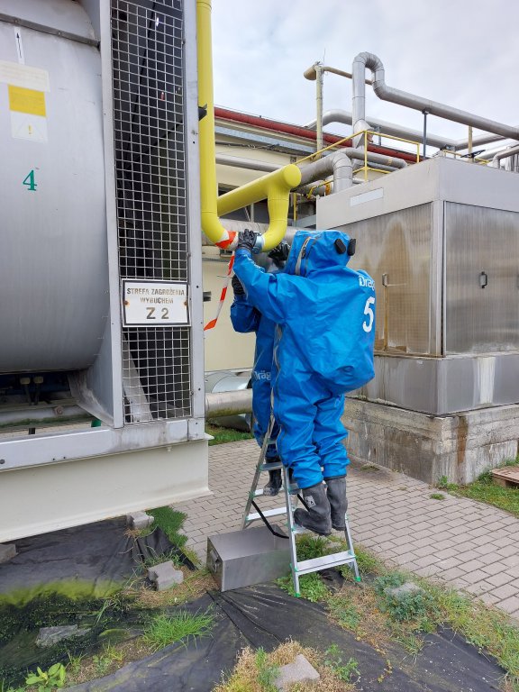 Działania strażaków z kilku sekcji PSP oraz jednostek OSP to skoordynowane ćwiczenia mające na celu sprawdzenie przygotowania służb na wypadek zdarzenia z wyciekiem niebezpiecznej substancji chemicznej. Scenariusz ćwiczeń odbywających się na terenie zakładu przetwórstwa mlecznego Spółdzielni Mleczarskiej w Piątnicy Zakład Produkcyjny w Ostrołęce zakładał wyciek amoniaku, po którym ogłoszono ewakuację.