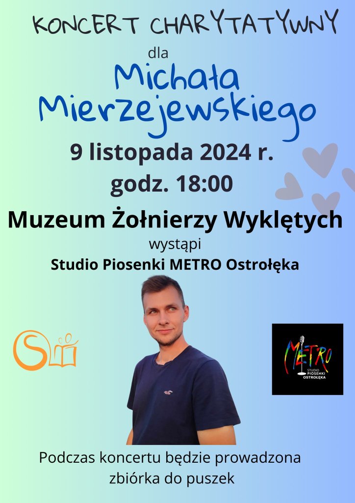 9 listopada o godzinie 18:00, Muzeum Żołnierzy Wyklętych w Ostrołęce stanie się miejscem wyjątkowego wydarzenia. W ramach koncertu charytatywnego wystąpi Studio Piosenki Metro Ostrołęka, by wesprzeć Michała Mierzejewskiego.