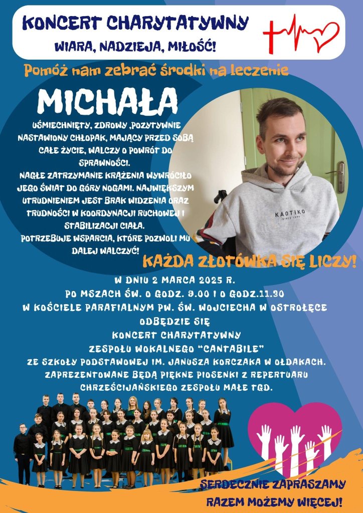W niedzielę, 2 marca 2025 roku, w kościele parafialnym pw. św. Wojciecha w Ostrołęce odbędzie się wyjątkowe wydarzenie - koncert charytatywny pod hasłem "Wiara, Nadzieja, Miłość!". Celem koncertu jest zebranie środków na leczenie Michała, młodego mężczyzny, który zmaga się z poważnymi problemami zdrowotnymi.