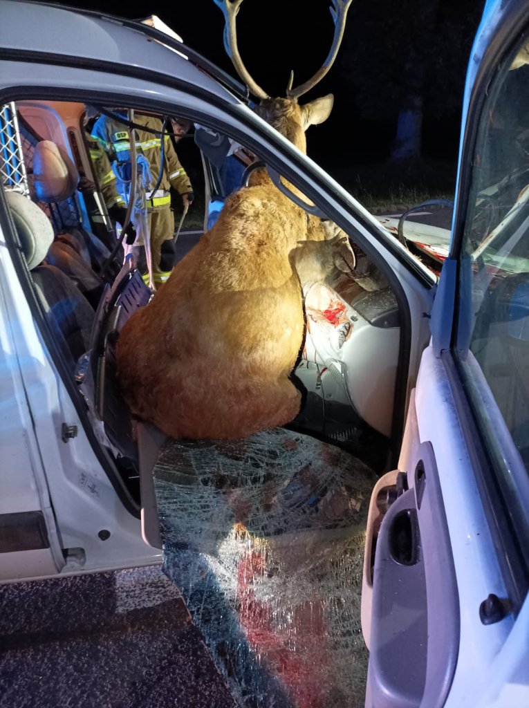Niebezpieczny wypadek na drodze krajowej nr 61. Przed rozpędzoną osobówkę wbiegł jeleń. Zwierzę zostało potrącone i przez przednią szybę wpadło do wnętrza auta.