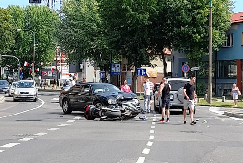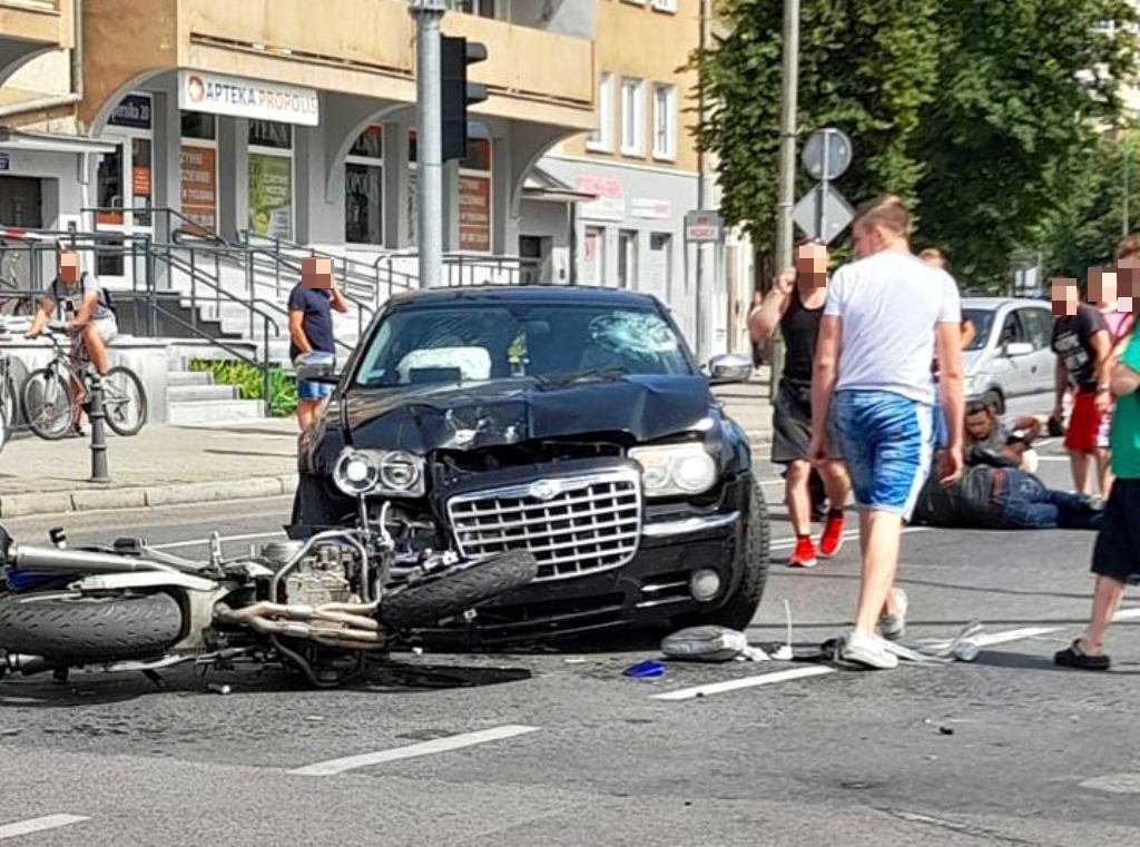 Kierowca jednośladu po zderzeniu z autem długo leżał na jezdni. Pomoc wezwali przechodnie oraz kierowcy, którzy byli świadkami zderzenia.