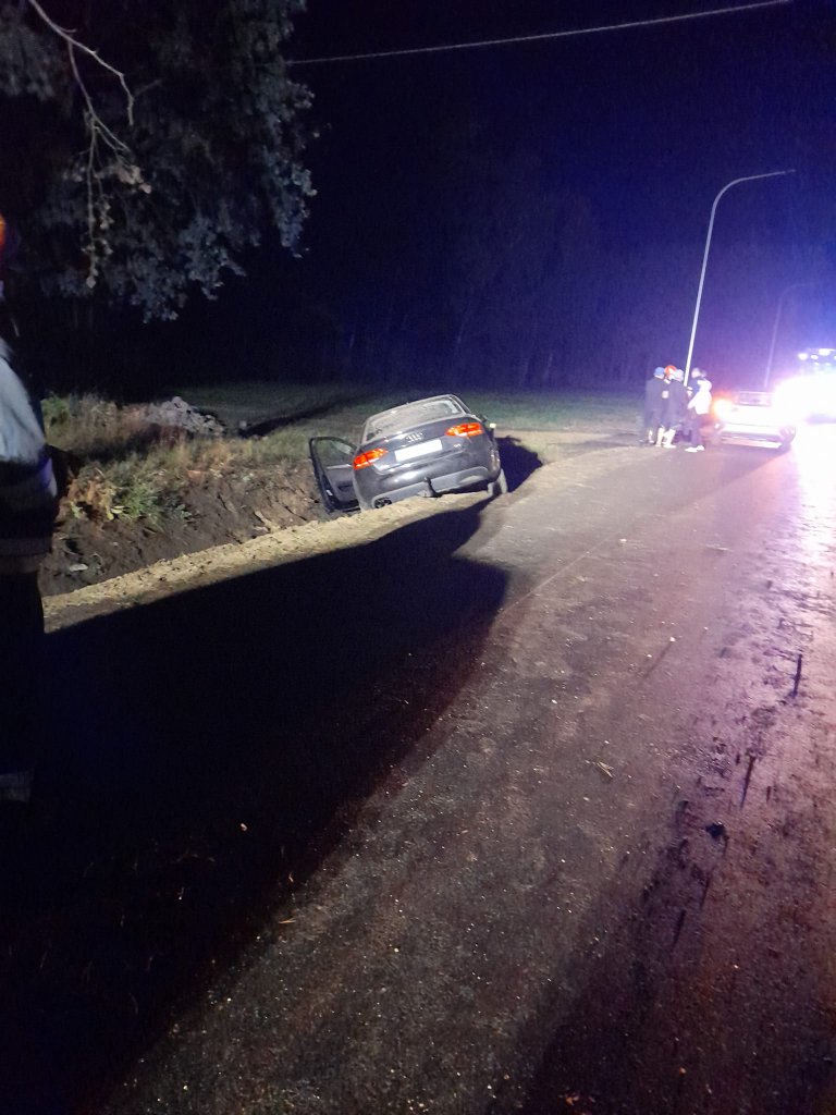 Kierujący audi z niewyjaśnionych jeszcze okoliczności, stracił panowanie nad pojazdem wypadł z jezdni i wpadł do przydrożnego rowu. Auto uderzyło przodem w skarpę ziemi i zostało poważnie uszkodzone.
