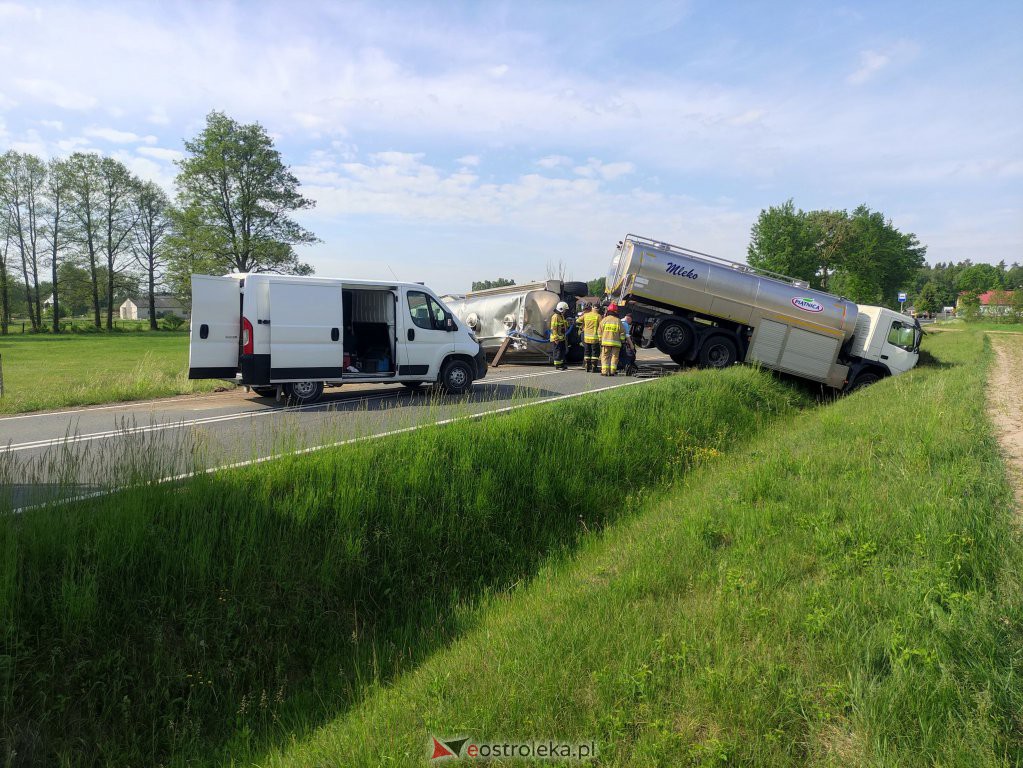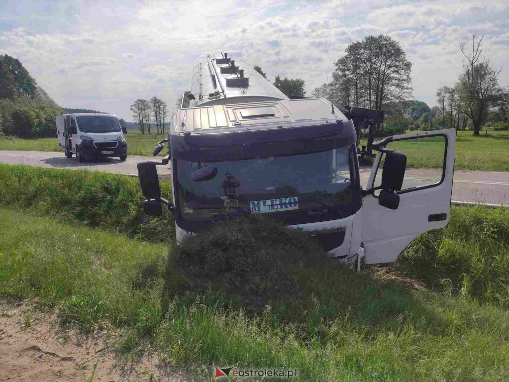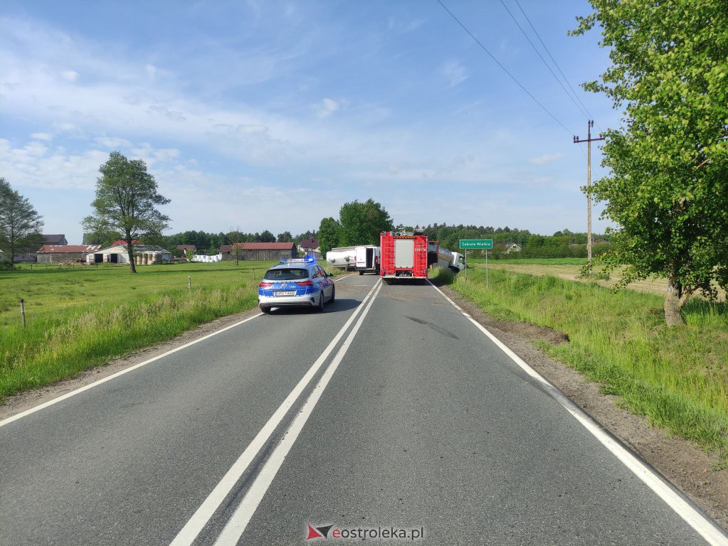 W miejscowości Zabiele Wielkie doszło w sobotę o poranku do niebezpiecznego zdarzenia. Kierujący cysterną z mlekiem z niewyjaśnionych przyczyn zjechał nagle na pobocze i wpadł do przydrożnego rowu. Cysterna z mlekiem doczepiona do ciężarówki wywróciła się na bok całkowicie blokując drogę. W wyniku zdarzenia nikt nie odniósł obrażeń.