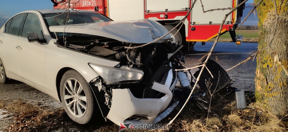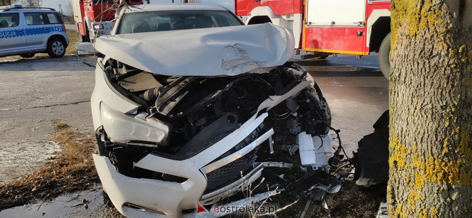 Do wypadku doszło około godz. 9:00 w czwartek, 20 stycznia na drodze powiatowej między Ostrołęką a Goworowem w okolicach miejscowości Żabin. Na śliskiej nawierzchni kierująca infiniti straciła panowanie nad pojazdem, wpadła w poślizg i uderzyła w przydrożne drzewo.