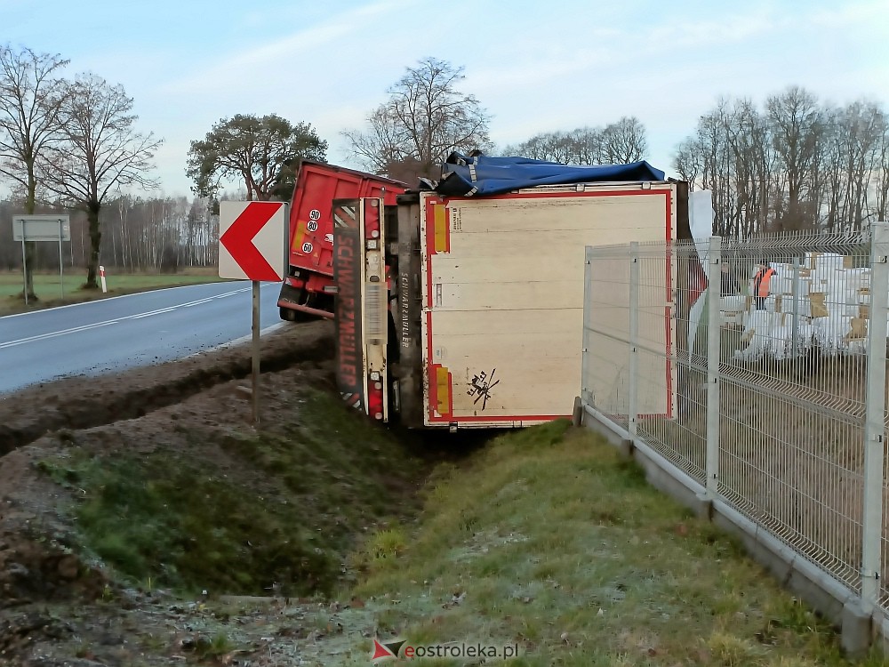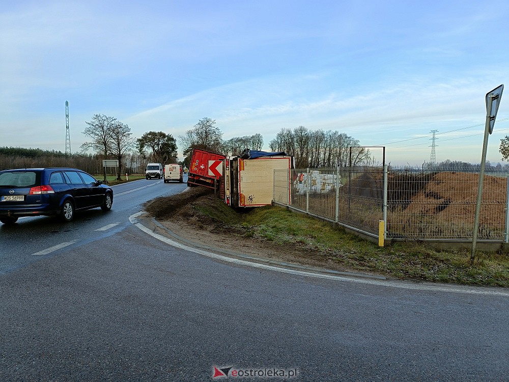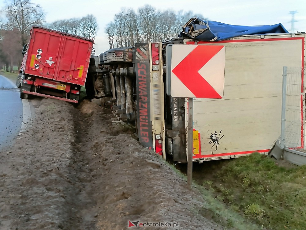 Na śliskiej nawierzchni w Zamościu pod Ostrołęką kierujący ciężarówką na ostrym wirażu stracił panowanie nad pojazdem i wypadł z drogi. Naczepa, w której przewożony był ładunek przewróciła się na bok. Kilka minut później w tym samym miejscu i z tego samego powodu - śliskiej nawierzchni - w poślizg wpadł kolejny kierowca ciężarówki, co zakończyło się zderzeniem z leżącym na poboczu skladem.