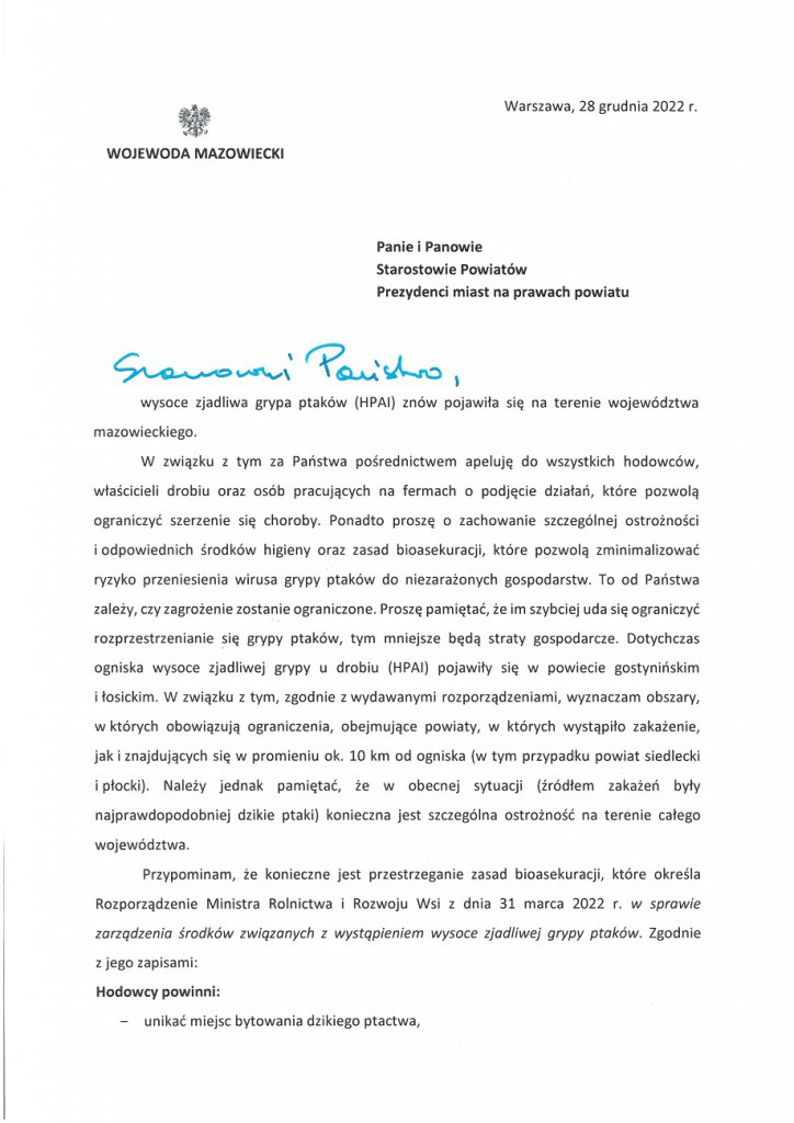 Wysoce zjadliwa grypa ptaków (HPAI) znów pojawiła się na terenie województwa mazowieckiego. W związku z tym, apeluję do wszystkich hodowców, właścicieli drobiu oraz osób pracujących na fermach o podjęcie działań, które pozwolą ograniczyć szerzenie się choroby. Proszę pamiętać, że im szybciej uda się zminimalizować rozprzestrzenianie się grypy ptaków, tym mniejsze będą straty gospodarcze