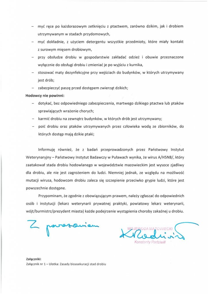 W związku z wykryciem przypadków wysoce zjadliwej grypy (HPAI) na terenie województwa mazowieckiego, Wojewoda Mazowiecki Konstanty Radziwiłł zaapelował do hodowców drobiu o podjęcie działań mających na celu ograniczyć do minimum możliwość rozprzestrzeniania się grypy ptaków.