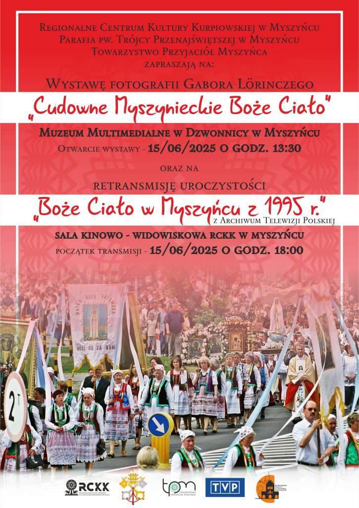 W niedzielę w myszynieckiej dzwonnicy (godz. 13:30) odbędzie się promocja wystawy fotograficznej „Cudowne Myszynieckie Boże Ciało" autorstwa Gabora Lörinczego, dokumentującej ubiegłoroczną procesję. Wydarzenie obejmuje prezentację zdjęć oraz premierę albumu fotograficznego.