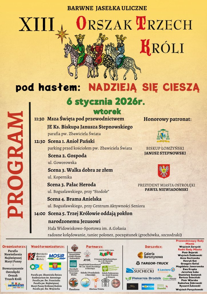 Już w najbliższy wtorek, 6 stycznia 2026 roku, mieszkańcy Ostrołęki będą mieli okazję uczestniczyć w jednym z najbarwniejszych wydarzeń religijno-kulturalnych w regionie. Po raz trzynasty ulicami naszego miasta przejdzie Orszak Trzech Króli. Tegoroczna edycja barwnych jasełek ulicznych odbywa się pod hasłem: „Nadzieją się cieszą”.