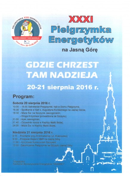 „Gdzie chrzest tam nadzieja”, pod takim hasłem odbędzie się XXXI Pielgrzymka Energetyków na Jasną Górę. Pracownicy firm energetycznych z całej Polski, spotkają się w dniach 20-21 sierpnia na wspólnej modlitwie.